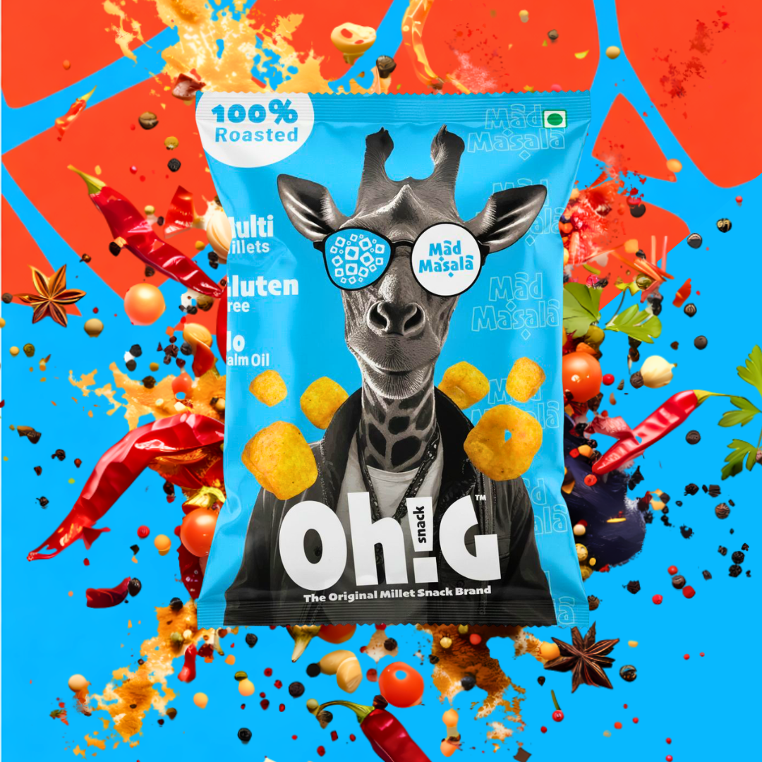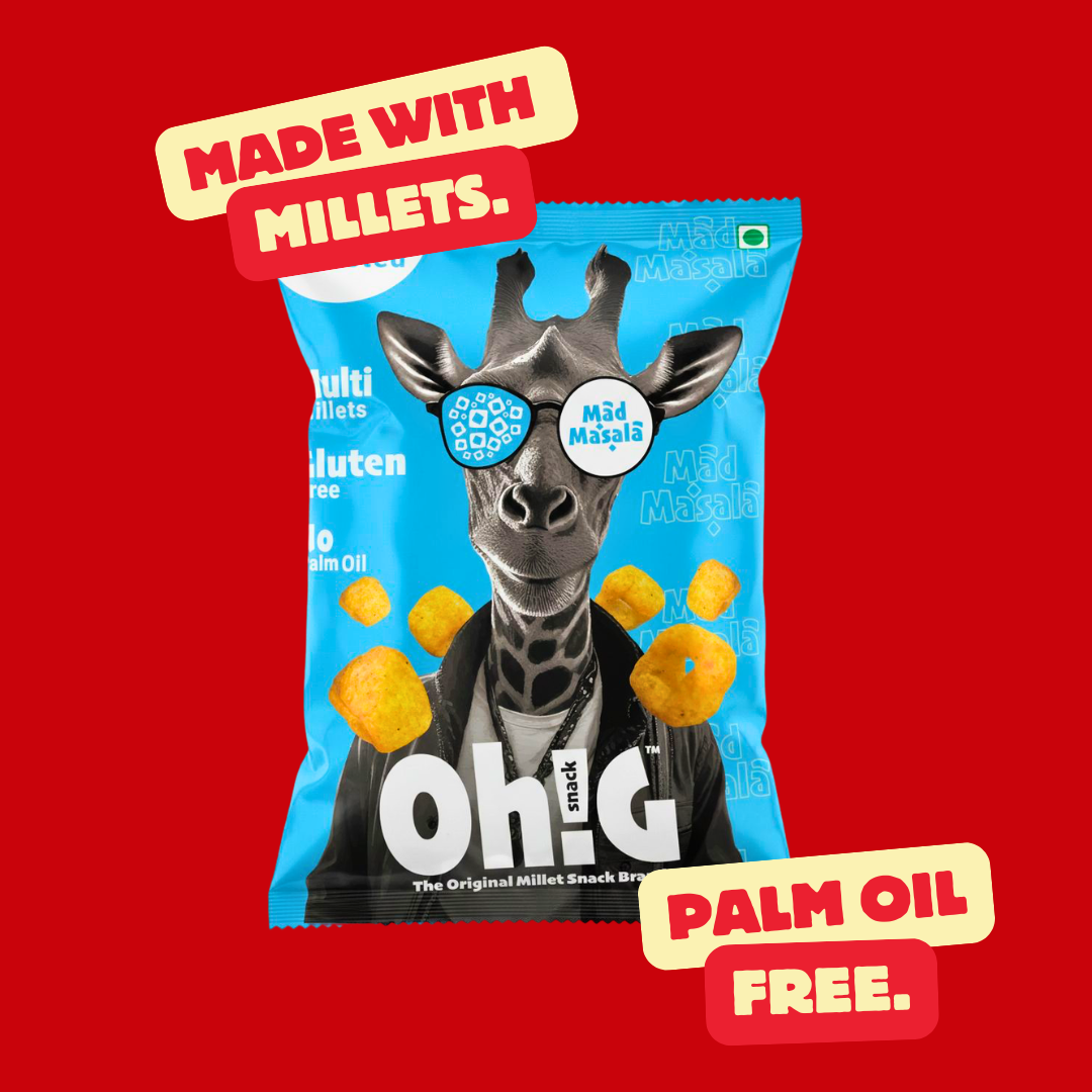 A multi-millet snack with a desi flavor that makes Mad Masala on the top of your favorite. Made from Jowar, Bajra, Ragi and more, the crunchy snack are out there to offer you one of your best snacking experience. 100% roasted , moderately spicy, tangy and minty to make it a perfect masaledar snack buddy for you.